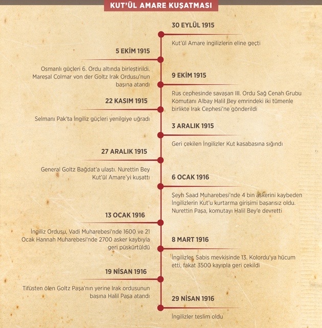 Osmanlı ordusu, Kut'ül Amare'yi kuşatmak için 2. Ordu komutanı Halil Paşa'yı görevlendirdi. Halil Paşa, kuşatmayı sıkılaştırdı ve İngiliz-Hint kuvvetlerini açlığa ve susuzluğa mahkum etti.