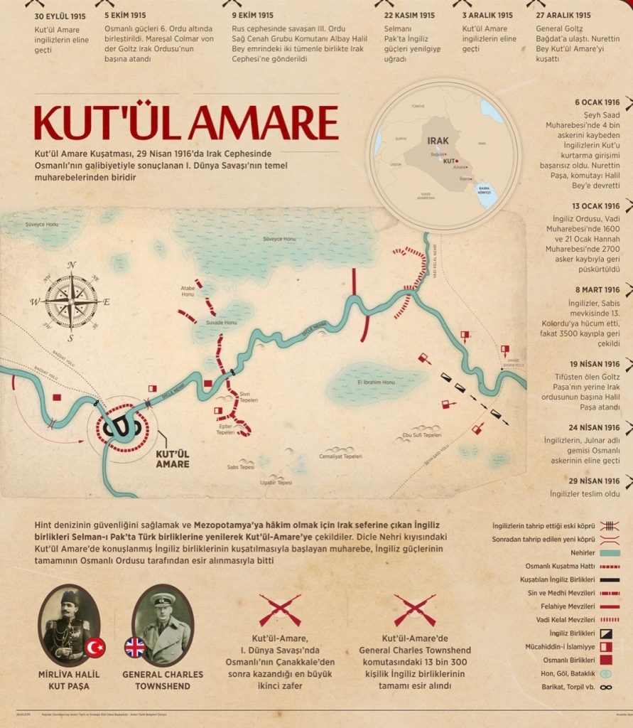 I. Dünya Savaşı'nın Irak Cephesi'nde, İtilaf Devletleri ile İttifak Devletleri arasında gerçekleşen Kut'ül Amare Kuşatması, Türk tarihinin en önemli dönüm noktalarından biri olarak kabul edilir. Bu muharebe, İtilaf Devletleri'nin Orta Doğu'daki ilerleyişini durdurdu ve Osmanlı İmparatorluğu'nun savaştaki moralini yükseltti.