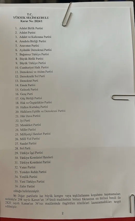 Yüksek Seçim Kurulu (YSK) Başkanı Ahmet Yener, 31 Mart 2024 Pazar günü gerçekleştirilecek Mahalli İdareler Seçimleri'ne katılma hakkı elde eden 36 siyasi partiyi duyurdu.