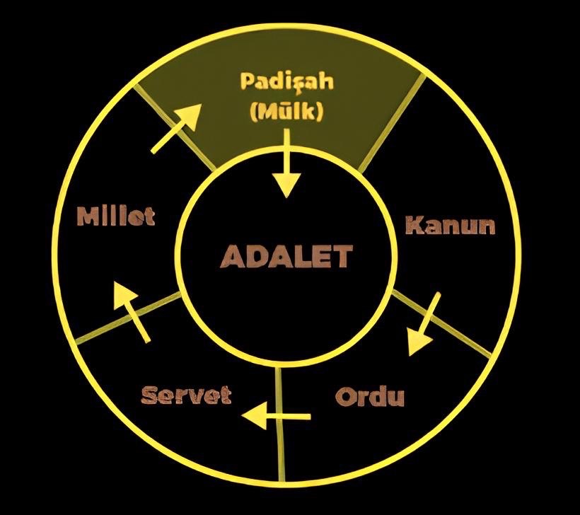 Osmanlı İmparatorluğu'nun temel devlet felsefelerinden biri olan Adalet Çemberi, Nizamülmülk tarafından ortaya atılmış ve Osmanlılar tarafından geliştirilmiştir. Bu kavram, Kanuni Sultan Süleyman döneminde Kınalızâde Ali Efendi gibi düşünürlerin eserleriyle daha da derinleştirilmiş ve Osmanlı devletinin varlığını sürdürmesinde önemli bir rol oynamıştır. Bu çerçevede, Adalet Çemberi, Osmanlı siyaset düşüncesinin merkezinde yer almış ve devletin yönetim anlayışını şekillendirmiştir.