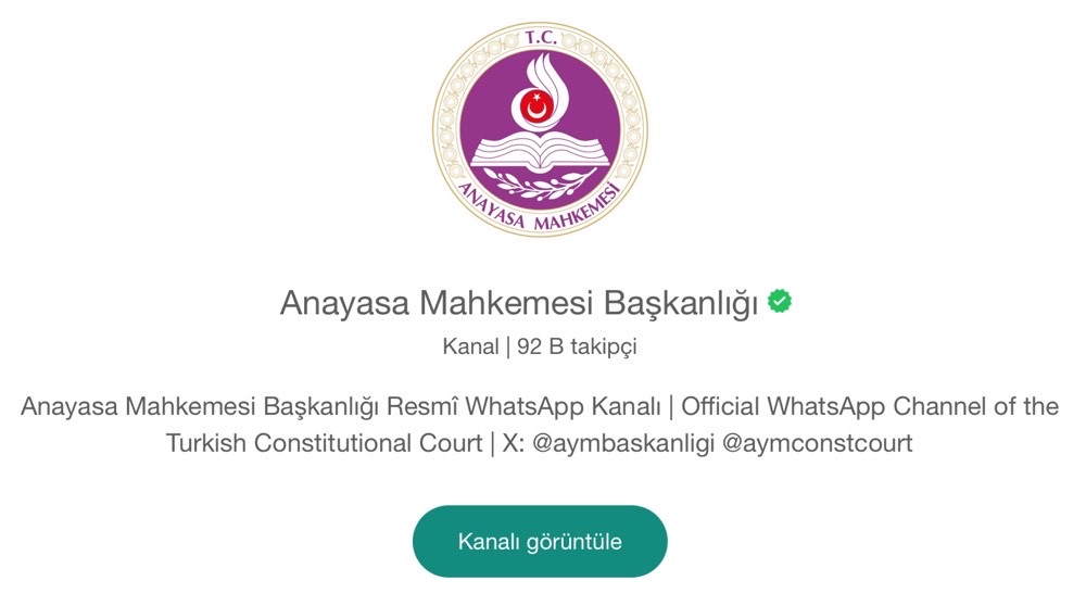 Anayasa Mahkemesi kararlarına ilişkin basın duyurularının ve mahkemenin faaliyetlerinin kısa sürede geniş kitlelerin bilgisine sunulması amacıyla “Anayasa Mahkemesi WhatsApp Kanalı” kullanıma açıldı.