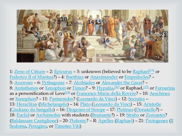Tabloda resmedilen filozoflar ve düşünürler, Antik Yunan'dan gelme ve felsefenin farklı alanlarını temsil eden isimlerdir. Bu tabloda yer alan bazı önemli figürler şunlardır: