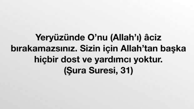 Yeryüzünde O’nu (Allah’ı) âciz bırakamazsınız. Sizin için Allah’tan başka hiçbir dost ve yardımcı yoktur. Şura Suresi, 31