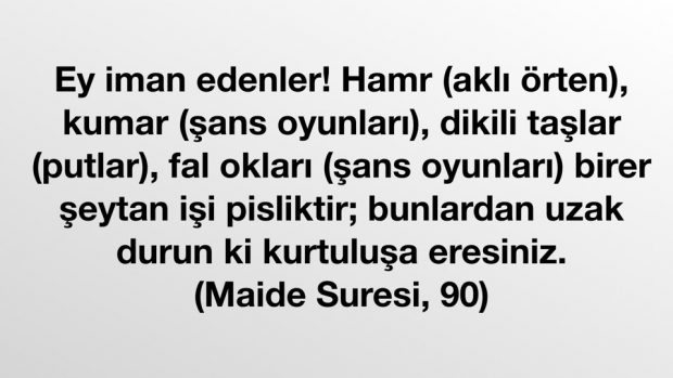 Ey iman edenler! Hamr (aklı örten), kumar (şans oyunları), dikili taşlar (putlar), fal okları (şans oyunları) birer şeytan işi pisliktir; bunlardan uzak durun ki kurtuluşa eresiniz. Maide Suresi, 90