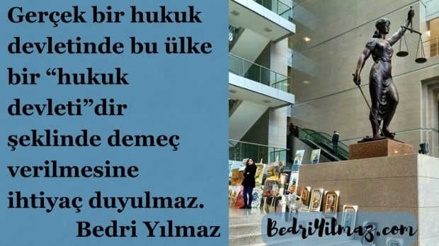 Gerçek bir hukuk devletinde bu ülke bir “hukuk devleti”dir şeklinde demeç verilmesine ihtiyaç duyulmaz. Bedri Yılmaz