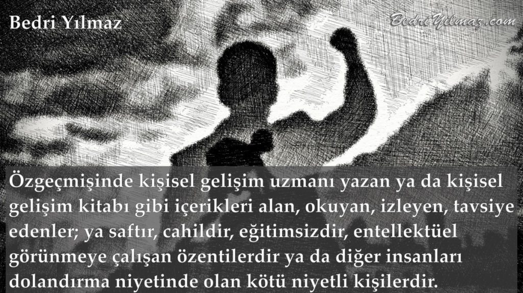 Özgeçmişinde kişisel gelişim uzmanı yazan ya da kişisel gelişim kitabı gibi içerikleri alan, okuyan, izleyen, tavsiye edenler; ya saftır, cahildir, eğitimsizdir, entellektüel görünmeye çalışan özentilerdir ya da diğer insanları dolandırma niyetinde olan kötü niyetli kişilerdir.