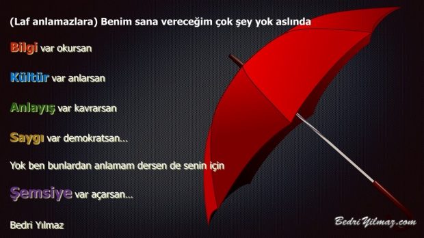 (Laf anlamazlara) Benim sana vereceğim çok şey yok aslındaBilgi var okursanKültür var anlarsanAnlayış var kavrarsanSaygı var demokratsanYok ben bunlardan anlamam dersen de sana hediyem şemsiye var açarsan Bedri Yılmaz Views: 0