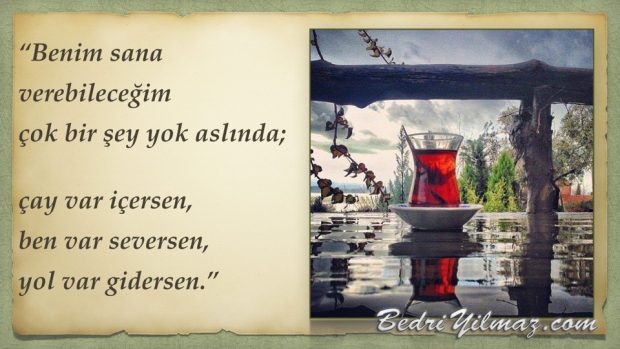 Özellikle sosyal medyada sıkça paylaşılan ‘Benim sana verebileceğim çok şey yok aslında. Çay var içersen, ben var seversen, yol var gidersen’ dizeleri, yayımlanmış 157, yayımlanmamış 6 eserde yer almamaktadır.