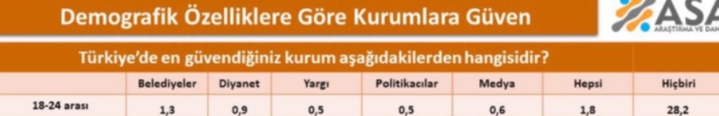 Türkiye'de gençlerin toplumsal kurumlara olan güvenini anlamak, onların gelecekteki tutum ve davranışlarını şekillendiren temel dinamikleri ortaya koymak açısından büyük bir öneme sahiptir. 2024 yılında ASAL Araştırma Şirketi'nin gerçekleştirdiği "Demografik Özelliklere Göre Kurumlara Güven" anketi, 18-24 yaş aralığındaki gençlerin Diyanet İşleri Başkanlığı'na duyduğum güvenin %0,9 gibi oldukça düşük bir seviyede olduğunu göstermektedir. Bu düşük güven oranı, Türkiye'deki gençlerin dinî otoritelerle olan ilişkilerini ve toplumsal dinamikler içindeki yerini yeniden değerlendirmek için önemli bir veri sunmaktadır.