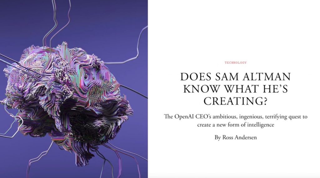 Ünlü girişimci, yatırımcı ve OpenAI'nin eş başkanı ve bir vizyoner olan Sam Altman ve OpenAI (ChatGBT) hakkında 24 Temmuz 2023 tarihinde Atlantik dergisinde yapay zeka ile ilgili yayınlanmış bir makaleyi mutlaka okumanızı tavsiye ederim. Orjinal başlığı Does Sam Altman Know What He’s Creating? olan bu makaleyi google translate ile paylaşıyorum.