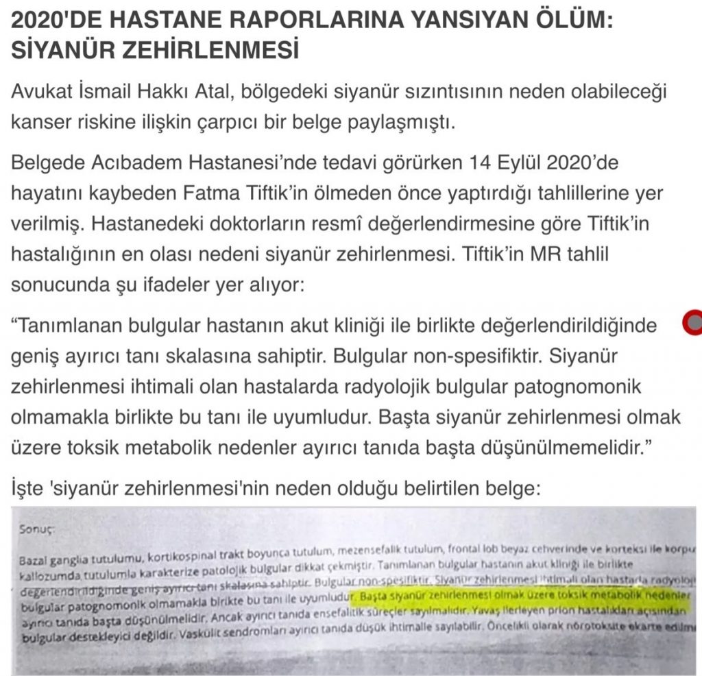- Siyanür sızıntısı olup olmadığına dair net bir bilgi paylaşılmıyor.