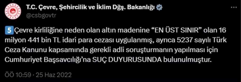 - Çevre, Şehircilik ve İklim Değişikliği Bakanlığı: Siyanür sızıntısı olmadığını ve atık barajının sağlam olduğunu açıkladı.