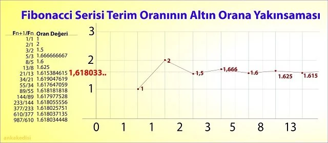 - Altın oran ilişkisi: Fibonacci dizisindeki ardışık terimler birbirine oranlandığında yaklaşık olarak 1.618 (altın oran) değerini yakalar. Bu altın oran, sanat, mimari ve doğada görülen birçok yapıda estetik bir denge unsuru olarak kabul edilir.