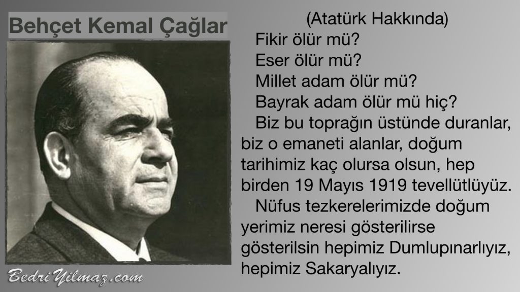 Nüfus tezkerelerimizde doğum yerimiz neresi gösterilirse gösterilsin hepimiz Dumlupınarlıyız, hepimiz Sakaryalıyız. Behçet Kemal Çağlar