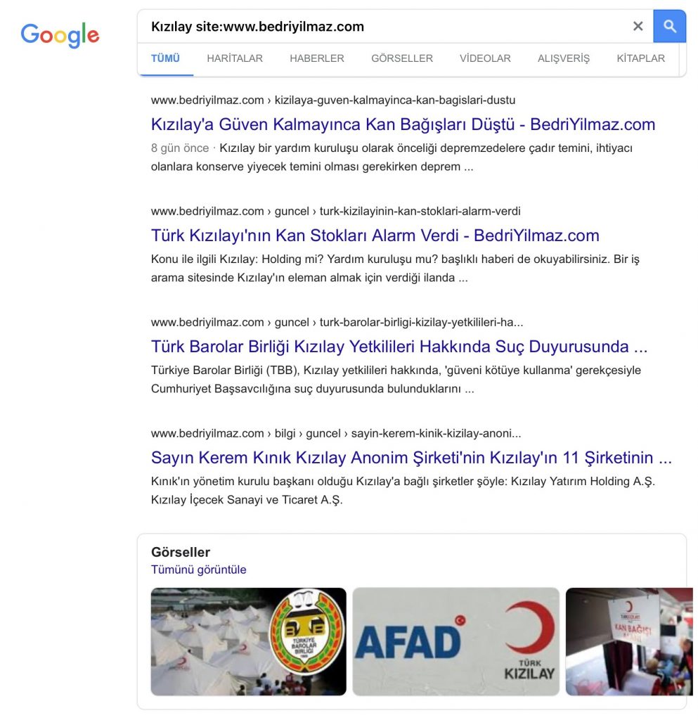 Bir kelimeyi belli bir internet sitesi içinde aramak istiyorsunuz diyelim. Google bu hizmeti vermektedir. google.com da arama kutusuna aramak istediğiniz kelimeyi yazıp site: yazıp boşluk bırakmadan iki nokta üst üsteden sonra internet adresini girip aratırsanız gelen sonuçlar o kelimenin sadece o sitede geçen linklerden oluşacaktır. Örnek vereyim. Kızılay kelimesini bedriyilmaz.com sitesinde hangi linklerde yer aldığını öğrenmek istiyorsunuz. google'ın arama kutusuna aşağıdaki gibi yazmalısınız.