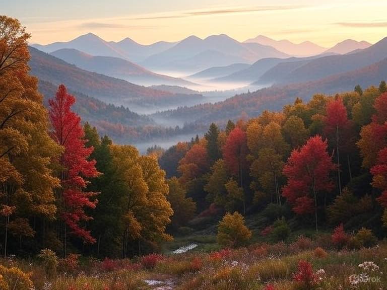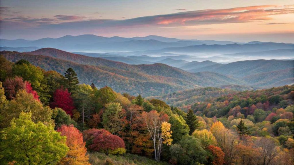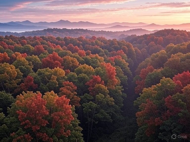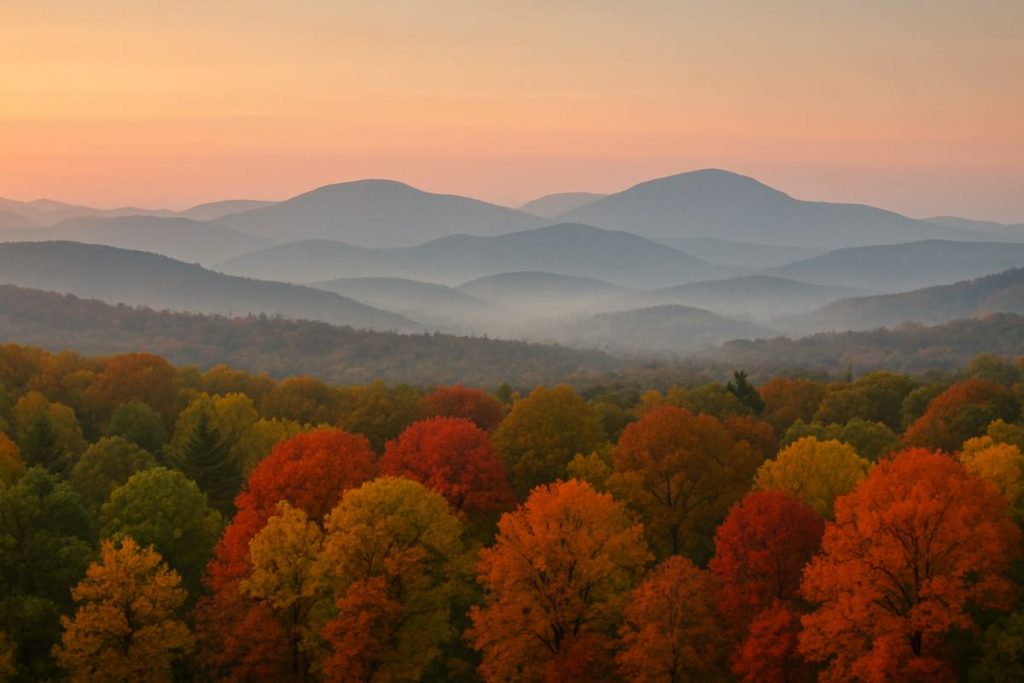 Wide-angle autumn landscape with layered mountain ranges in the background, soft color gradient in the sky, gentle mist over the scene. In the foreground, dense forest with tree canopies in vibrant fall colors — a mix of green, red, yellow, and brown leaves — transitioning between seasons. Ultra-realistic colors, soft haze atmosphere, highly detailed.