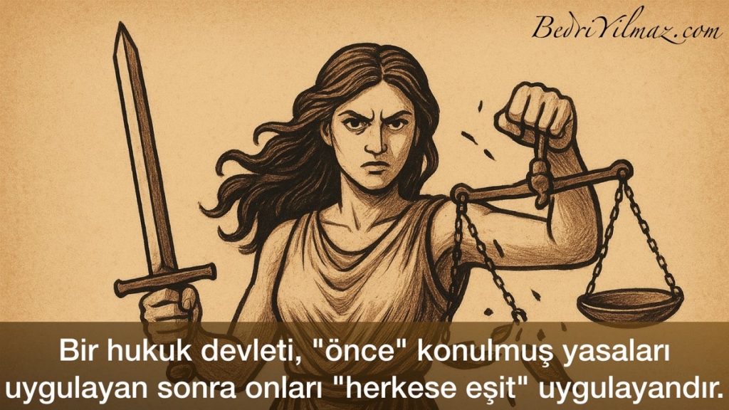 Bir hukuk devleti, "önce" konulmuş yasaları uygulayan sonra onları "herkese eşit" uygulayandır.
