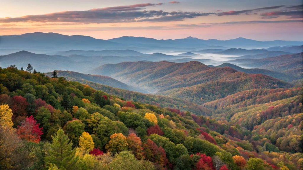 Wide-angle autumn landscape with layered mountain ranges in the background, soft color gradient in the sky, gentle mist over the scene. In the foreground, dense forest with tree canopies in vibrant fall colors — a mix of green, red, yellow, and brown leaves — transitioning between seasons. Ultra-realistic colors, soft haze atmosphere, highly detailed.