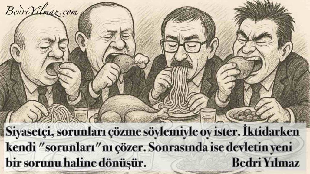 Türkiye’de siyasetçi, sorunları çözme söylemiyle oy ister. İktidarken kendi “sorunları”nı çözer. Sonrasında ise Türkiye’nin yeni bir sorunu haline dönüşür. Bedri Yılmaz