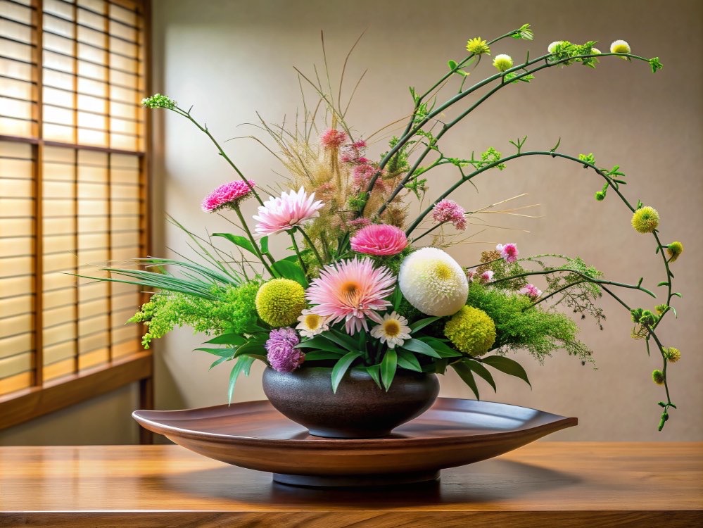 Ikebana, Japon çiçek düzenleme sanatıdır ve kelime anlamı olarak "yaşayan çiçekler" anlamına gelir. Bu sanat, çiçeklerin, dalların ve yaprakların minimalist ve estetik bir şekilde düzenlenmesini içerir. Ikebana, sadece görsel güzelliği değil, aynı zamanda ruhsal denge ve uyumu da simgeler. Doğa ve insanın bir araya geldiği bu sanat, derin felsefi ve estetik prensiplerle şekillenir.