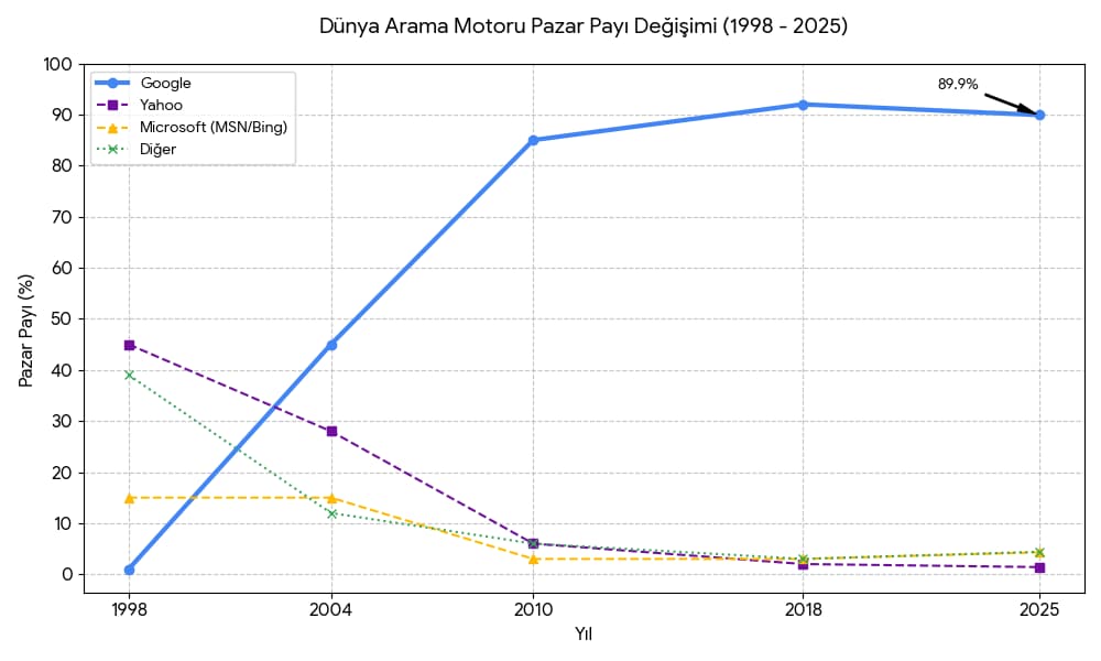 Önemli Not: 2024 sonu ve 2025 başı itibarıyla Google, son 10 yılda ilk kez (yapay zeka entegrasyonlu Bing gibi rakiplerin etkisiyle) %90 bandının çok hafif altına sarkmıştır. Ancak hala pazarın açık ara lideridir.