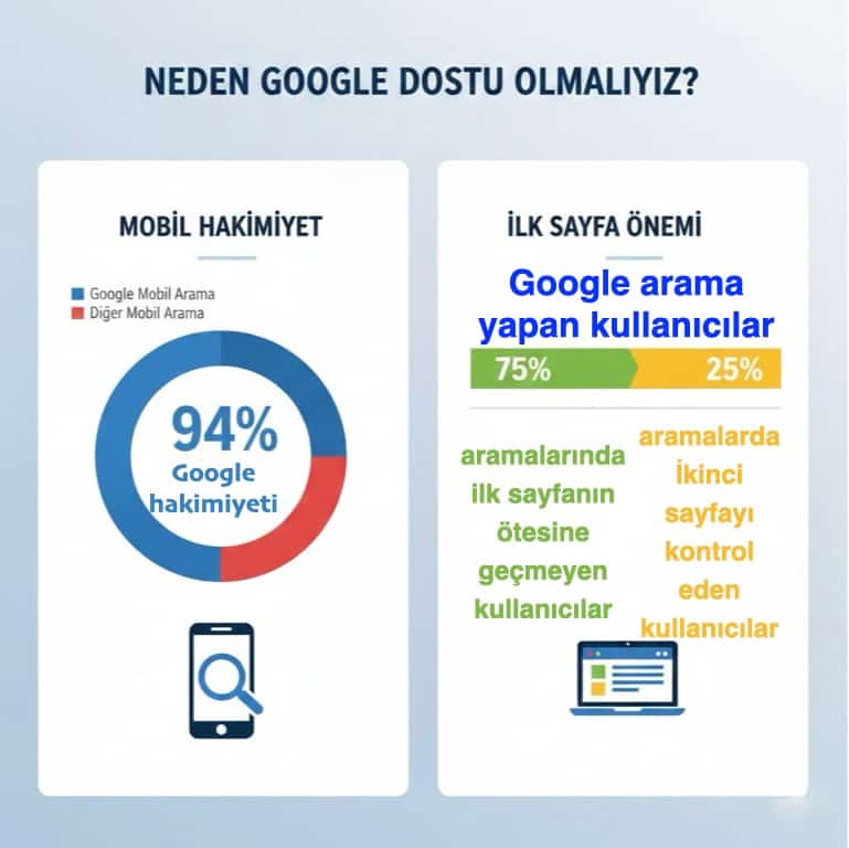 İnternet trafiğinin yarısından fazlası artık mobil cihazlardan geliyor. Mobil cihazlarda Google’ın etkisi çok daha sarsıcı: Dünyadaki mobil aramaların %94’ü Google üzerinden gerçekleştiriliyor. Eğer siteniz Google'ın mobil uyumluluk kriterlerine (hız, okunabilirlik, kullanıcı deneyimi) sahip değilse, akıllı telefon kullanan milyarlarca kişiye ulaşma şansınızı kaybedersiniz.