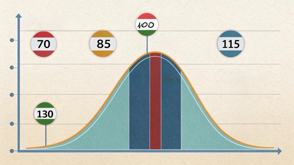 Modern IQ testleri, 100 puanı ortalama zekâ olarak kabul eder. Standart sapma genellikle 15’tir. Yani: