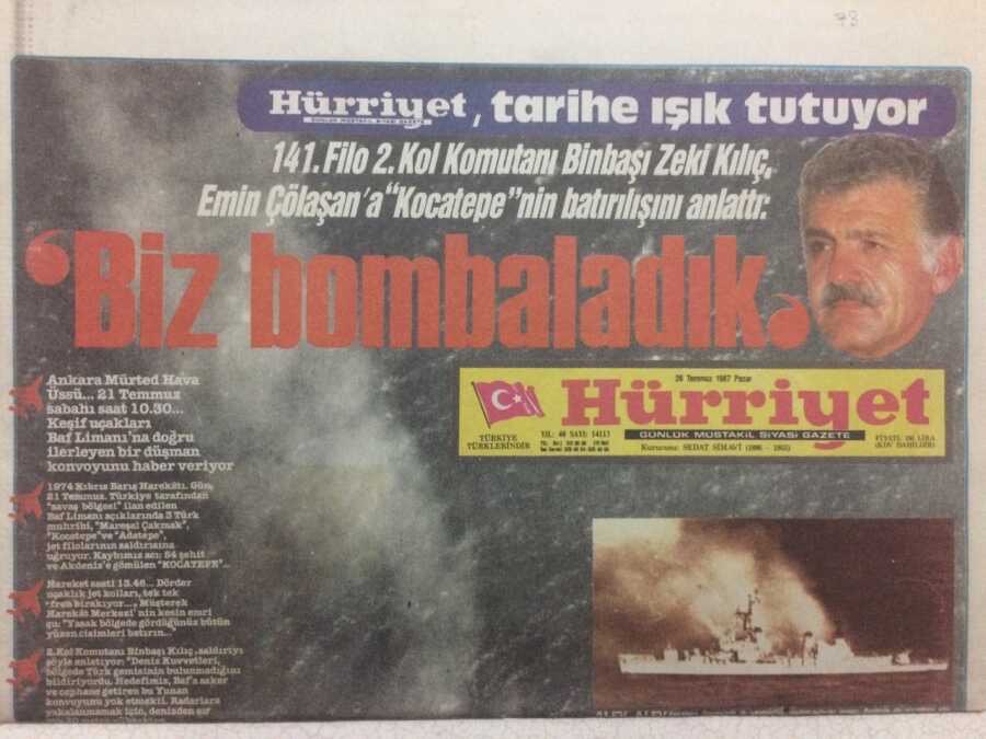 Emin Çölaşan, Kıbrıs Barış Harekâtı'nın 40. yılında 17-20 Temmuz 2014 tarihleri arasında Sözcü gazetesinde yayımlanan yazı dizisinde, 1974 Kıbrıs Barış Harekâtı sırasında Türk Hava Kuvvetleri'nin yanlışlıkla TCG Kocatepe muhribini vurup batırmasını detaylı bir şekilde ele almıştır. Bu yazı dizisi, olayın farklı boyutlarını aydınlatmak amacıyla, doğrudan olayın tanıklarıyla yapılan eski röportajlara dayanmaktadır.