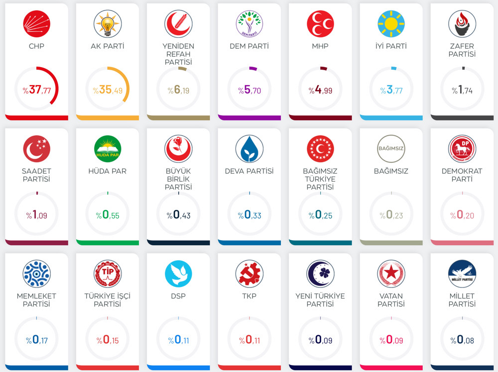 TRT Haber’in internet sitesinden 31 Mart 2024 Mahalli İdareler Genel Seçimleri Sonuçları‘nı temiz bir arayüz ile kolaylıkla inceleyebilirsiniz.