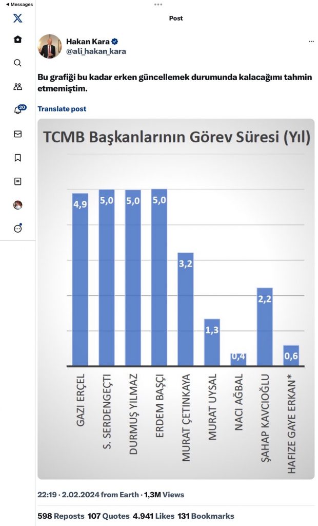 Merkez Bankası başkanlığının son değişiminden ardından son merkez başkanlarının görev sürelerinin azlığı ile ilgili sosyal medya hesabından paylaşımdan bulunmuştur.