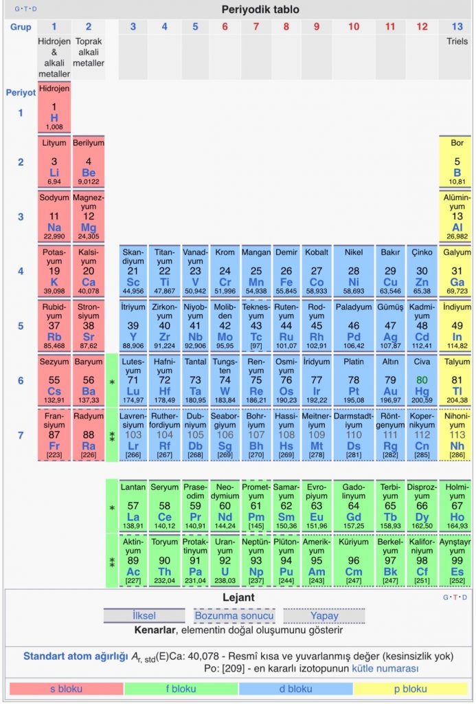 Günümüzde, periyodik tabloda 118 element yer almaktadır. Bu elementlerin 92'si doğal olarak bulunurken, 26'sı yapay olarak üretilmiştir.