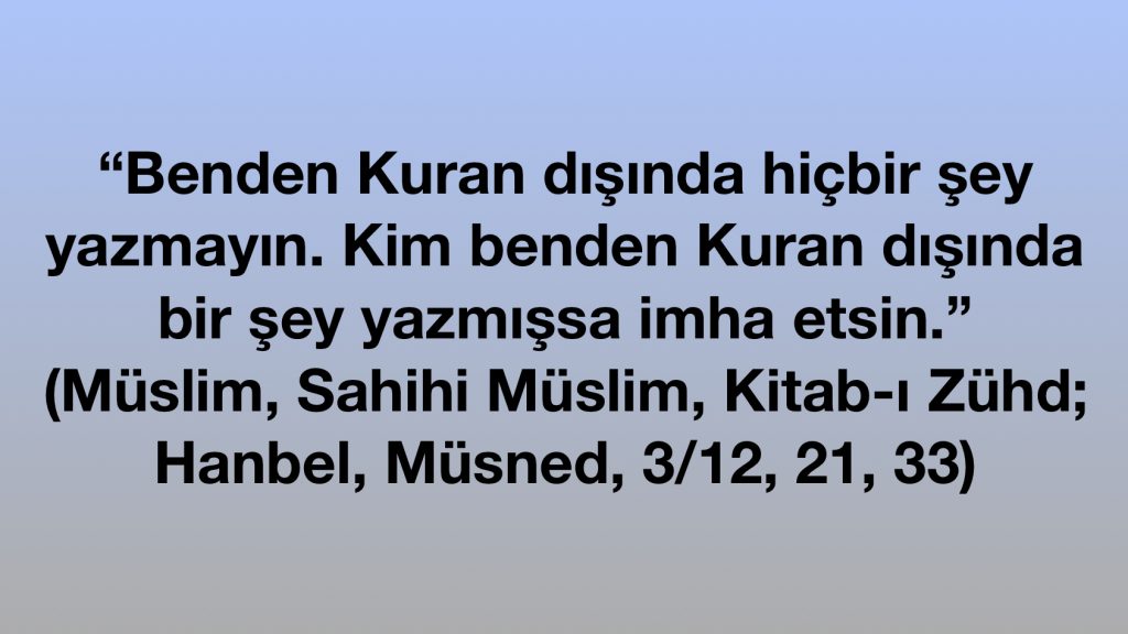 “Benden Kuran dışında hiçbir şey yazmayın. Kim benden Kuran dışında bir şey yazmışsa imha etsin.”