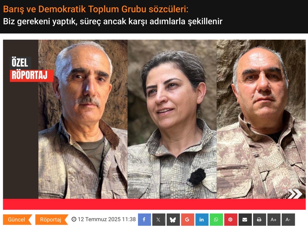 “Biz gerekeni yaptık, sıra Türkiye’de.” (Barış ve Demokratik Toplum Grubu sözcüleri: Biz gerekeni yaptık, süreç ancak karşı adımlarla şekillenir, Nu Medya 24, 12 Temmuz 2025)
