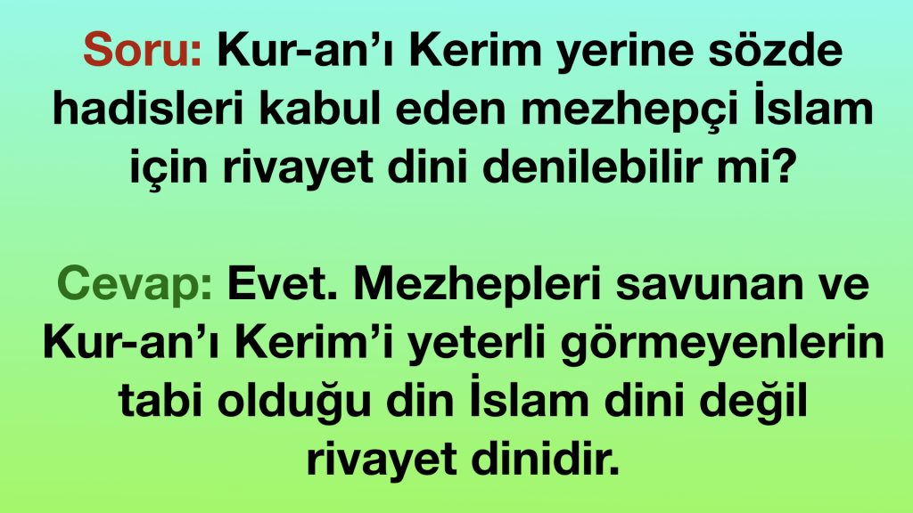 Soru: Kur-an’ı Kerim yerine sözde hadisleri kabul eden mezhepçi İslam için rivayet dini denilebilir mi?