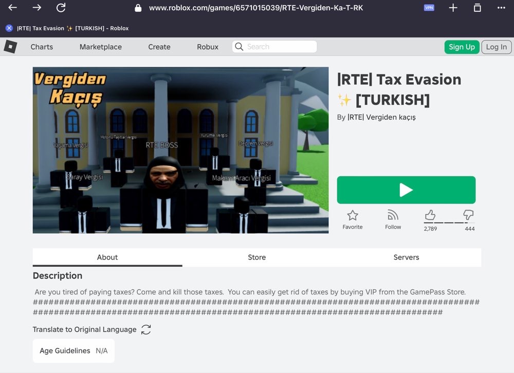 Roblox'ta yer alan "Recep Tayyip Erdoğan’ın Vergiden Kaçış" isimli oyun, bazı kesimler tarafından platformun yasaklanmasının asıl nedeni olarak gösteriliyor. Bu oyunun sayfasında, oyunu beğenerek destek verenlerin oranı % 86 iken, oyunu sevmediklerini belirtenlerin oranı % 14'e yakındı.