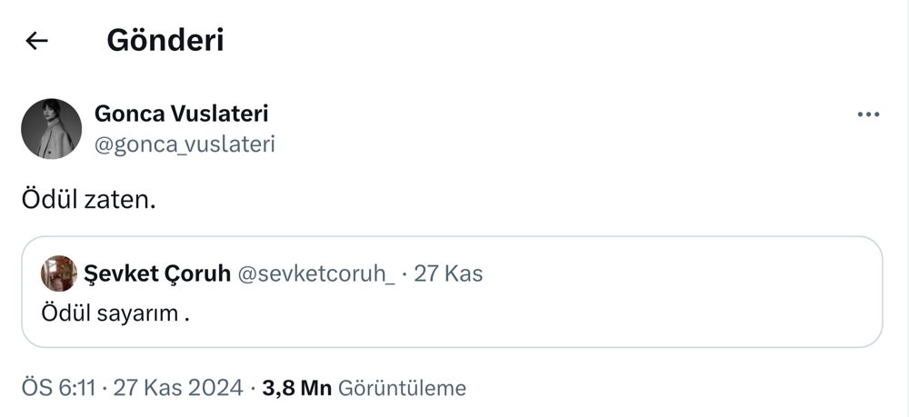 Şevket Çoruh’un bu paylaşımı ardından Gonca Vuslateri destek mahiyetinde 3.8 milyon görüntülenen “ödül zaten” şeklinde paylaşımda bulundu.