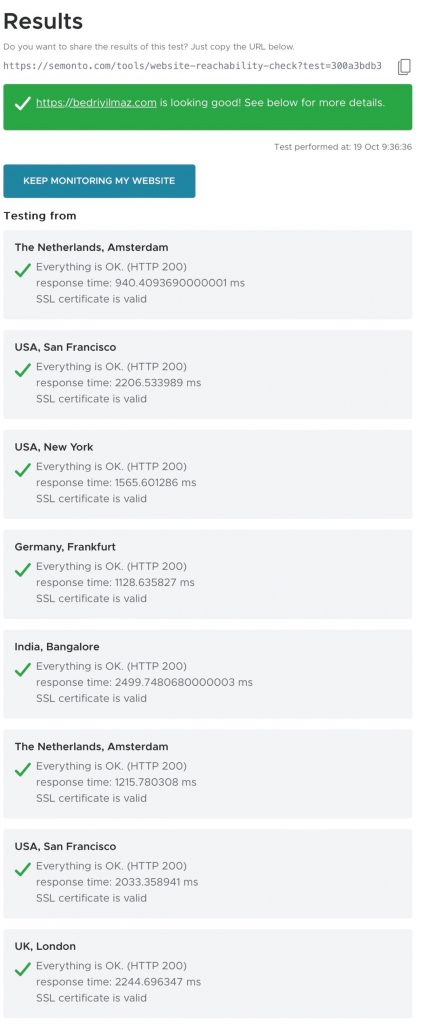 - Dünya çapında testler: Semonto, dünya üzerinde 100'den fazla konumda bulunan test merkezleri aracılığıyla web sitelerini test eder. Bu sayede, web sitenizin dünyanın her yerinden erişilebilir olup olmadığını kontrol edebilirsiniz.