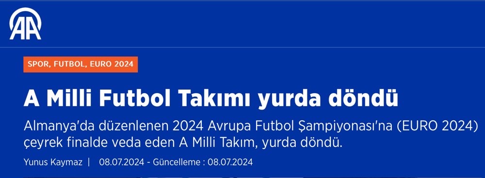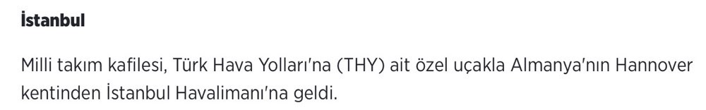 Türk Hava Yolları'na (THY) ait özel uçakla Almanya'nın Hannover kentinden İstanbul Havalimanı'na geldi. (A Milli Futbol Takımı yurda döndü, Anadolu Ajansı, 8 Temmuz 2024)