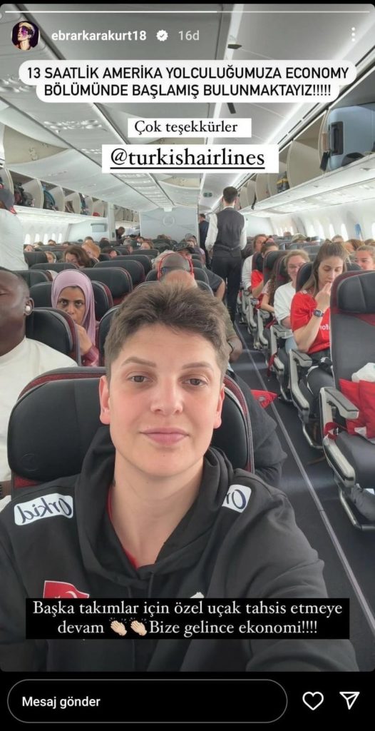 Halbuki 26 Mayıs 2024 tarihinde internet haber sitelerine düşen haberlere göre Türk Hava Yolları (THY) A Milli Kadın Voleybol Takımı oyuncularını Milletler Ligi maçları için 13 saatlik Amerika yoluculuğuna tarifeli uçakla ekonomi bölümünde tüm oyuncuları karışık koltuklarda yollamıştı. Milli kadın voleybol oyuncularımız sosyal medya hesaplarında Türk Hava Yollarının kendilerine yaşattığı sıkıntıları anlatır paylaşımlarda bulunmuşlardı. Örneğin;