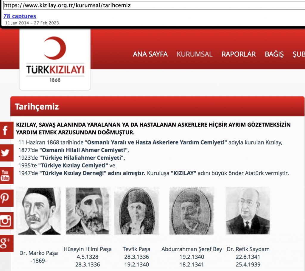 Türk Kızılayı'nın kendi kurumsal internet sitesinde Tarihçemiz bölümünde web.archive.org sitesinde 11 Temmuz 2014 tarihinde arşivlenen açıklamasına göre;