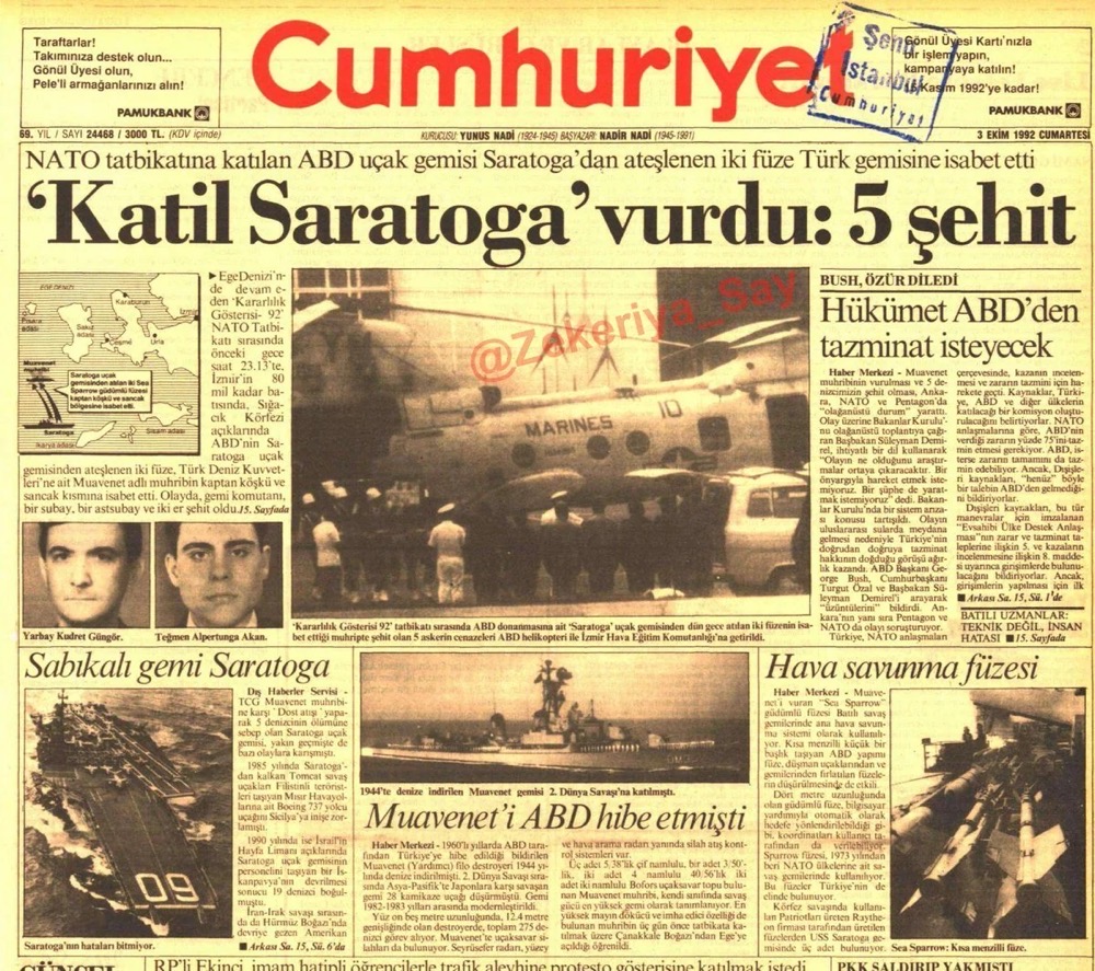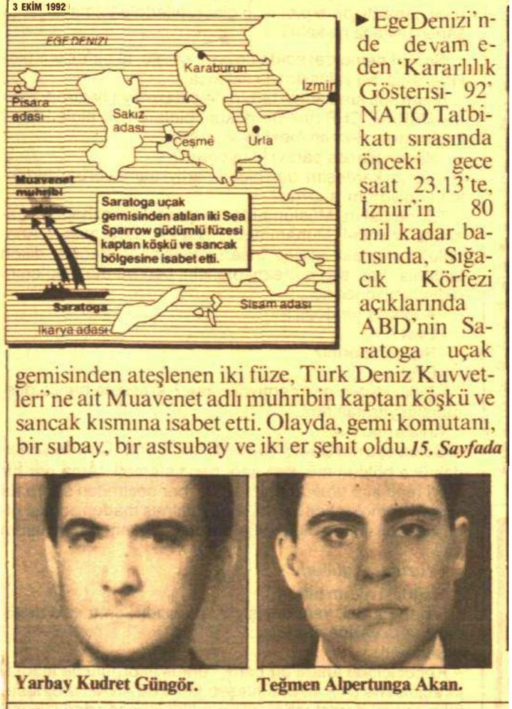 Tatbikatın bu safhasında ABD'ye ait USS Saratoga adlı uçak gemisinden ateşlenen iki adet RIM-7 Sea Sparrow hava savunma füzesi, Türk donanmasına ait Muavenet Firkateynini hedef aldı. Bu ani saldırı, Türk tarafında büyük bir şaşkınlık ve üzüntü yarattı. Füze saldırısı sonucunda gemi komutanı dahil olmak üzere beş Türk askeri hayatını kaybetti, 22 asker ise yaralandı.