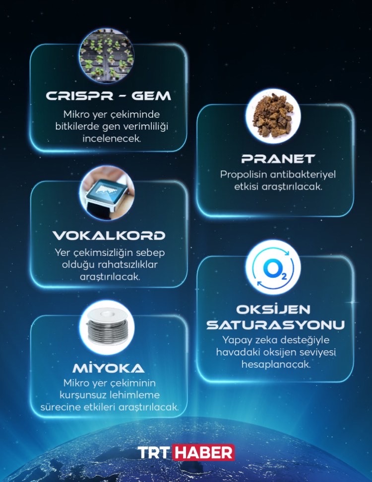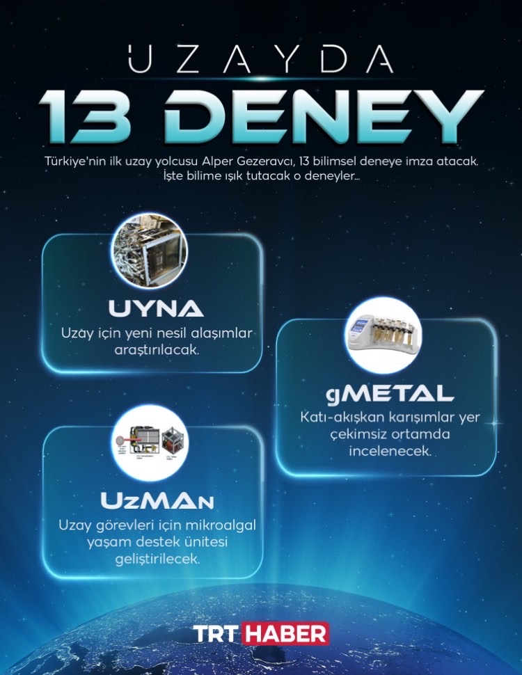 Özel bir firma ile uzaya çıkan Türkiye'nin ilk astronotu Alper Gezeravcı hazırlanan plan doğrultusunda bilim dünyasına ışık tutacak deneyler yaptı. Geniş bir yelpazeden seçilen deneyler ile bilimsel literatüre ve bilim dünyasına çok değerli katkılar sağladığı idida edilen deneylerin görüntüleri servis edildi.