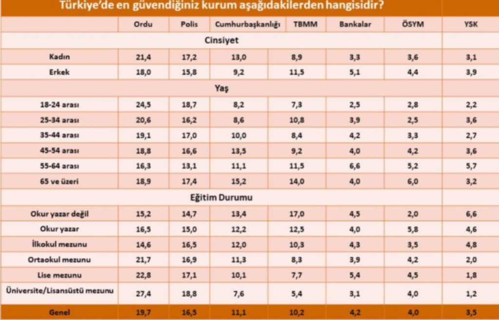 Toplamda, Türk toplumunun en çok güven duyduğu kurumlar arasında ordu (%19,7), polis (%16,5) ve diyanet (%2,0) gibi güvenlik ve din odaklı kurumlar öne çıkmaktadır. Buna karşın, medya (%0,9) ve politikacılar (%1,0) gibi kurumlara olan güven oldukça düşüktür. Genel olarak, toplumun %18,2'si hiçbir kuruma güvenmediğini belirtmiştir, bu oran, toplumsal güvenin ciddi bir şekilde zedelenmiş olduğuna işaret etmektedir.