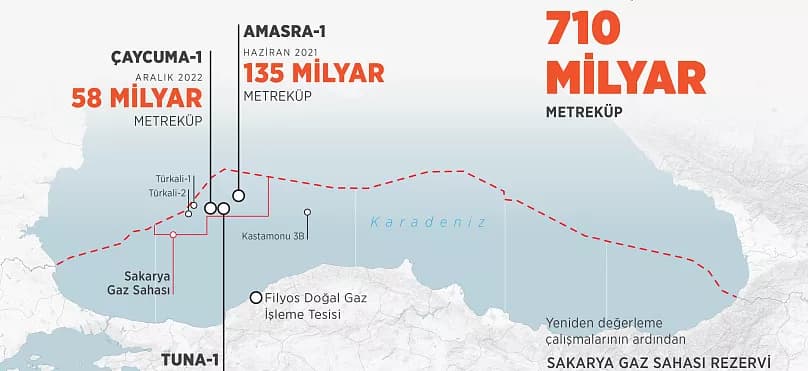 - 26 Aralık 2022 tarihinde Erdoğan, Karadeniz’deki keşifleri ve sahadaki rezervleri güncelleyerek, Çaycuma-1 sahasında 58 milyar metreküplük yeni rezerv bulunduğunu duyurdu; böylece toplam rezervin 710 milyar metreküpe ulaştığını ve bu rezervin uluslararası piyasa değerinin 1 trilyon doları bulduğunu belirtti. TRT Haber