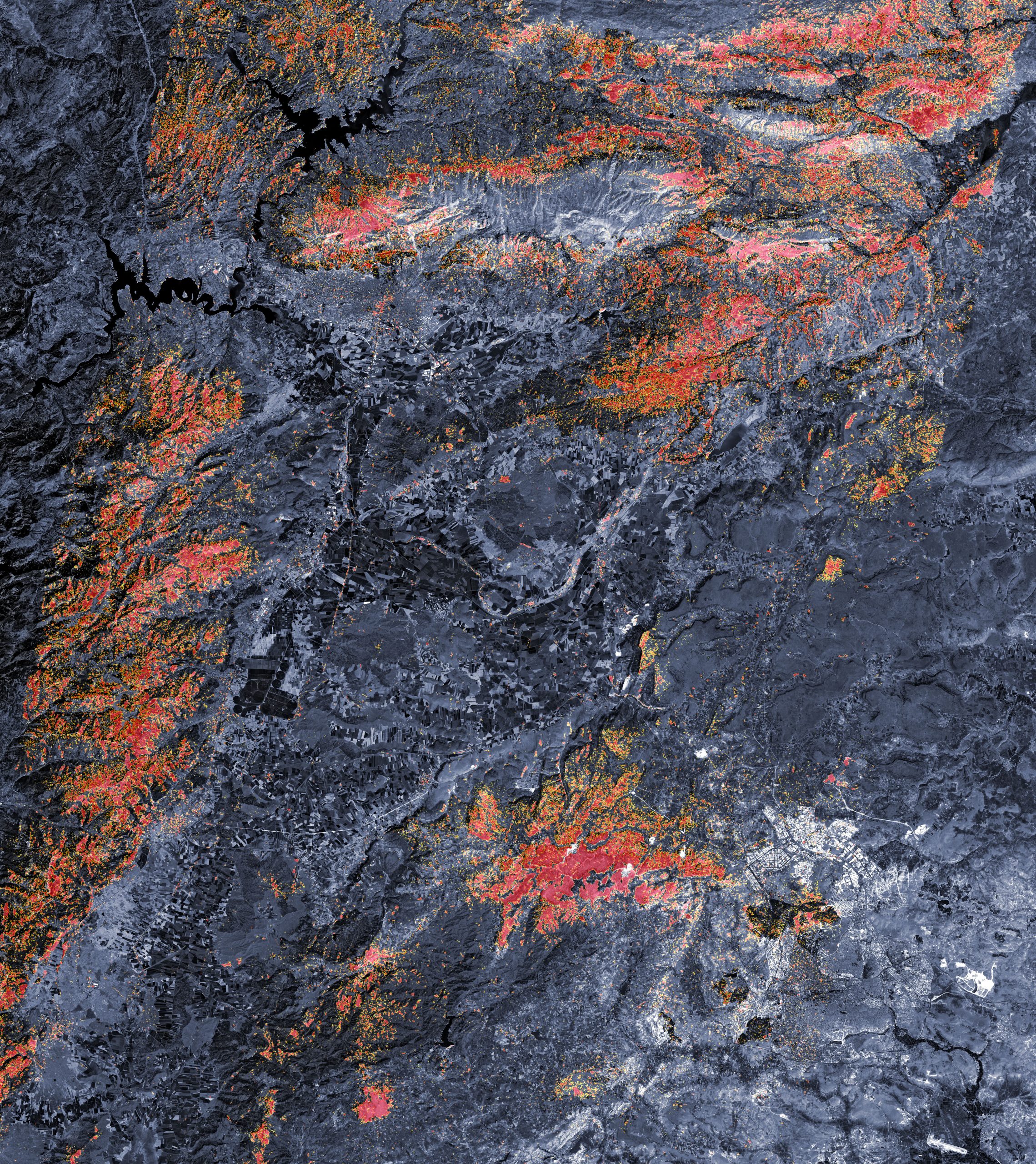 Aşağıdaki ön hasar temsili haritası Türkoğlu, Kahramanmaraş ve Nurdağı illerinin bazı kısımlarını göstermektedir. Koyu kırmızı pikseller, binalara, evlere ve altyapıya ciddi hasar verme veya arazide değişiklik yapma olasılığı yüksek alanları temsil ederken, turuncu ve sarı alanlar orta derecede veya kısmen hasar görmüş alanları göstermektedir. Her piksel yaklaşık 30 metre genişliğindedir.