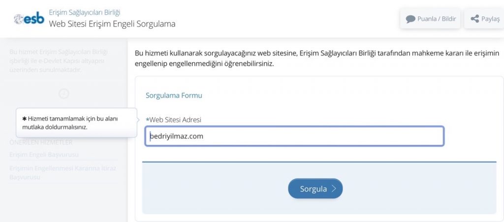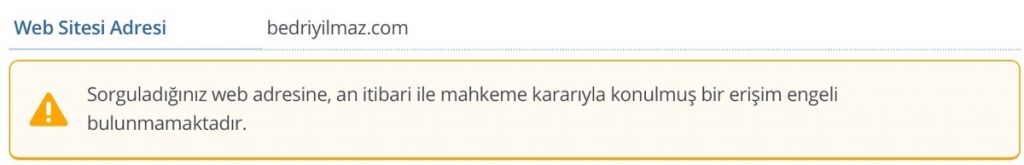 İnternet sitesine mahkeme kararı ile konulmuş bir erişim engeli olup olmadığını kontol etmek için Turkiye.gov.tr’nin portalından kontrol edebilirsiniz.