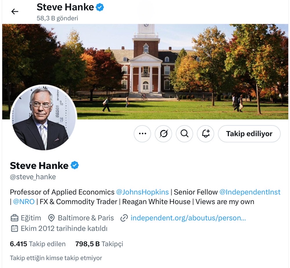 Steve Hanke, ekonomi dünyasında hem akademik hem de pratik alanda derin izler bırakmış bir isim. Johns Hopkins Üniversitesi’nde Uygulamalı Ekonomi Profesörü olan Hanke, aynı zamanda Cato Enstitüsü’nde Kıdemli Üye ve Bağımsız Enstitü’de (Independent Institute) katkıda bulunan bir düşünce lideri. X platformundaki hesabı (