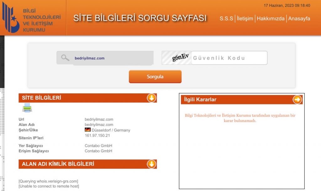 Aşağıdaki ekran görünütüsünde siteme ait Bilgi Teknolojileri ve İletişim Kurumu tarafından uygulanan bir karar bulunamadığı ile ilgili sorgu sonucunu görebilirsiniz.