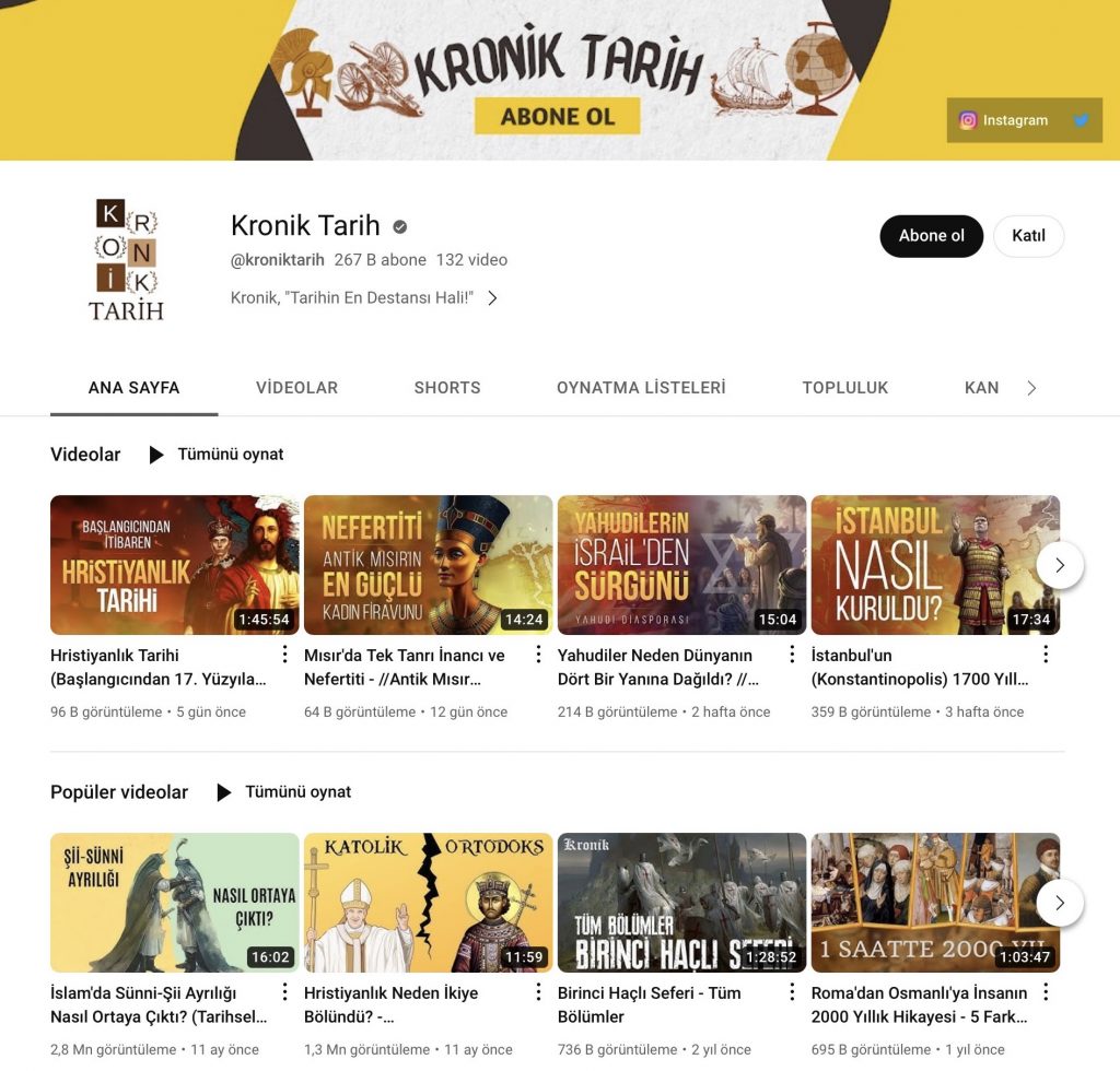 Kronik Tarih youtube kanalı henüz 2020 yılında açılmasına rağmen çok rağbet gören eğitim kanallarından oldu. Eğitci ve öğretici youtube kanalı kesinlikle tavsiye ediyorum.